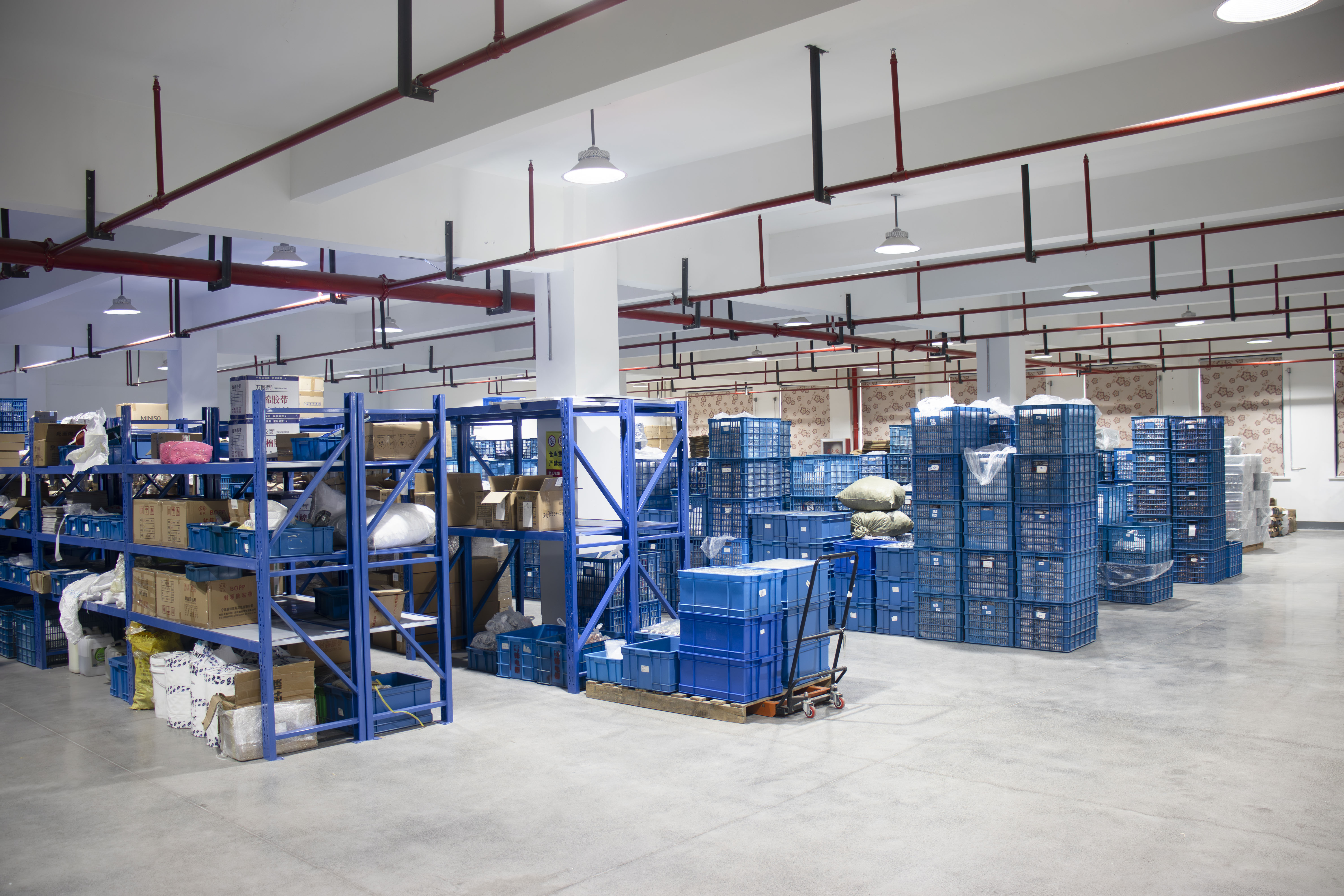 Workshop obsahuje svetlo modré epoxidové podlahy so žltými demarkačnými čiarami, ktoré jasne definujú pracovné oblasti a materiálové kanály. Komponenty sú kategorizované v modrých zásobníkoch, zatiaľ čo pracovné stanice montáže sú vybavené beztieňovými osvetľovacími a priemyselnými ventilačnými systémami. Zadné viacvrstvové police ukladajú výrobné materiály, synchronizované s kontrolnými terminálmi, aby sa monitorovali využitie materiálu v reálnom čase a minimalizovali prestoje.